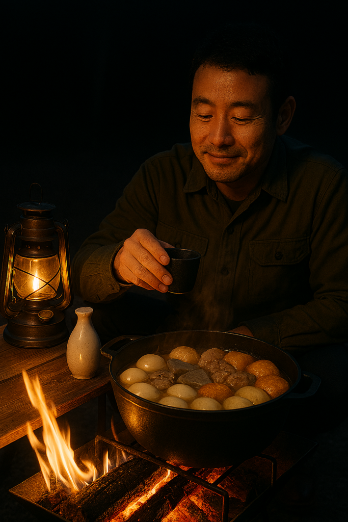 湯気・焚き火・ランタンの光が重なる瞬間は、まさに“ひとりキャンプ酒場”の世界。