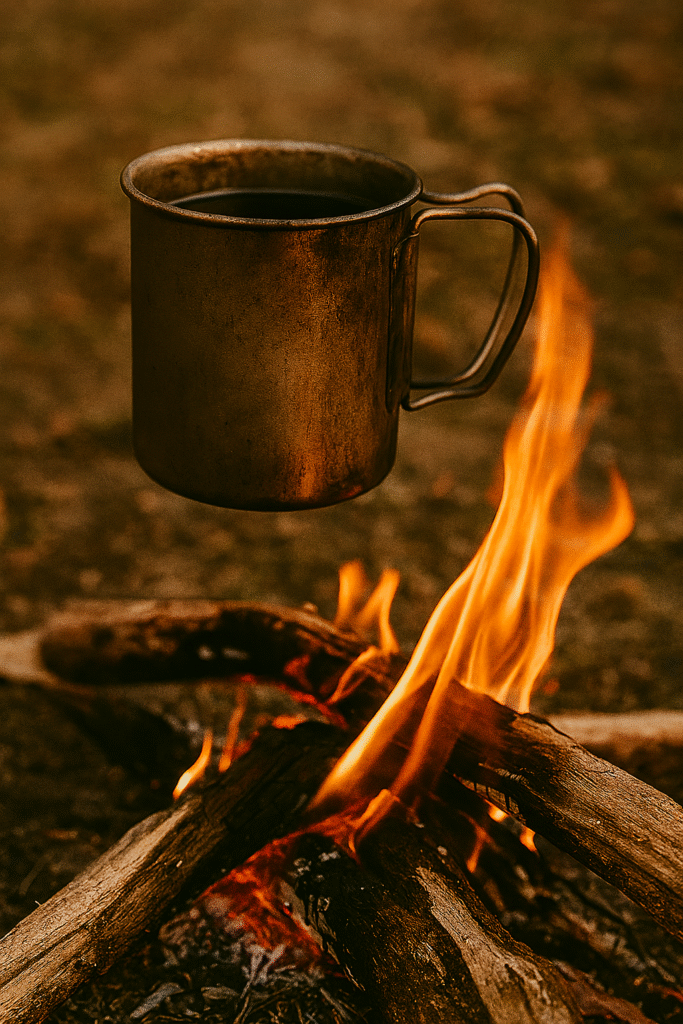 軽量で丈夫なチタン製マグ。直火OKなので、焚き火で温めたコーヒーをそのまま飲める。無骨な質感がキャンプシーンに映える。