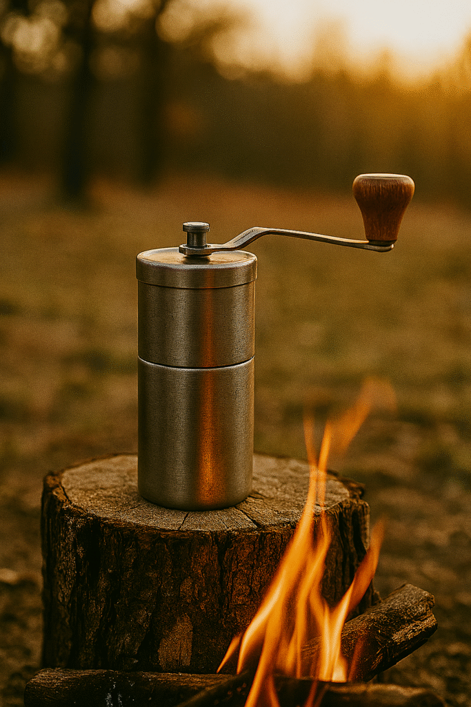 豆から挽くコーヒー体験をキャンプで。ステンレス製で持ち運びやすく、挽き心地も滑らか。朝の静かな時間に、豆を挽く音が心を整えてくれる。