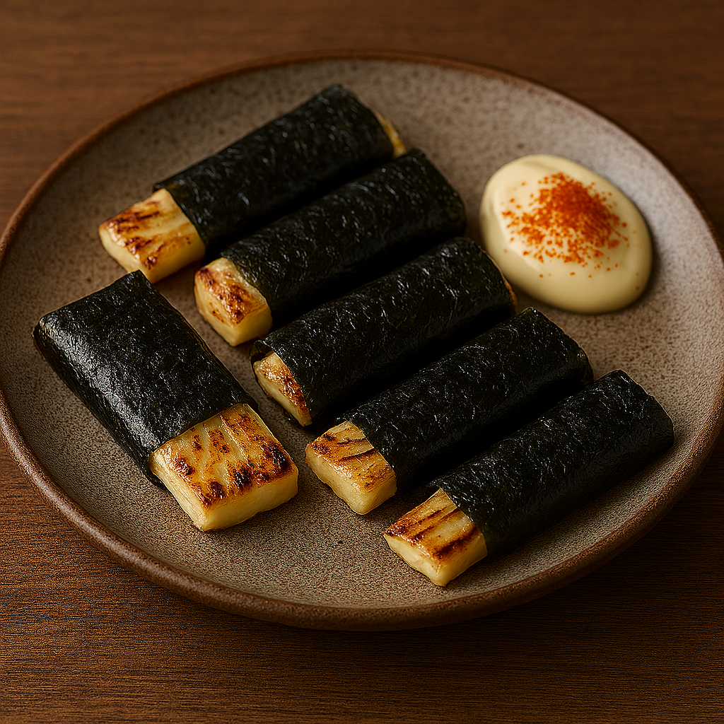 2. 焼き海苔で巻いて、マヨネーズ+一味を添えて完成!