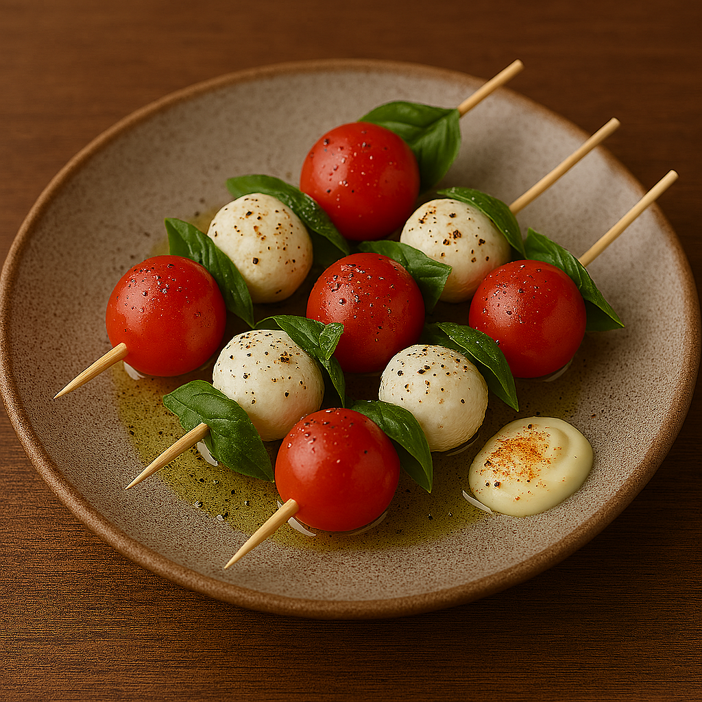 1. トマトとモッツァレラを交互に串に刺す