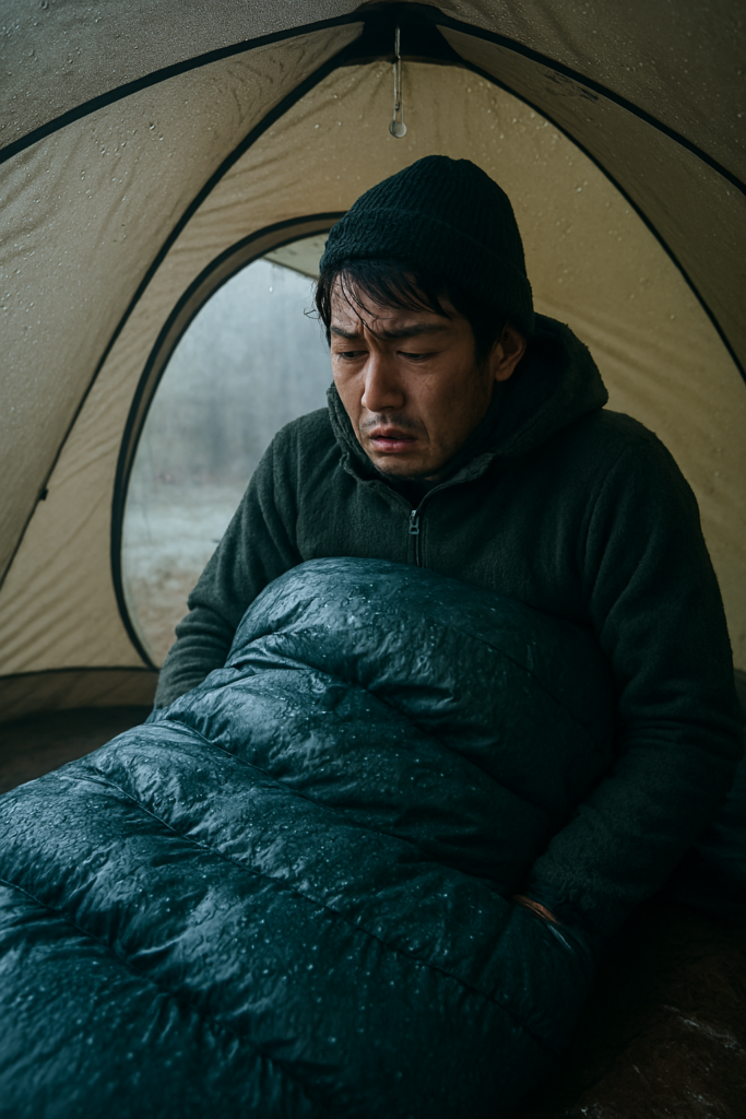 寝袋の表面が濡れていて、体も冷え切っていました。