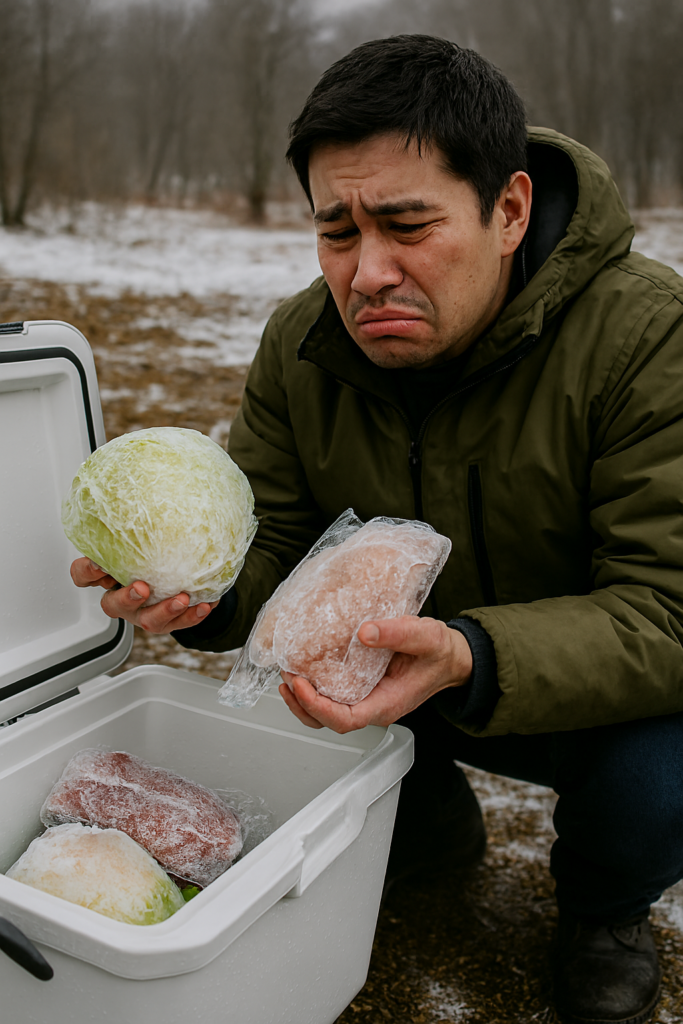 しかし、クーラーボックスの中でカチカチに凍結していて、包丁が通らない…。