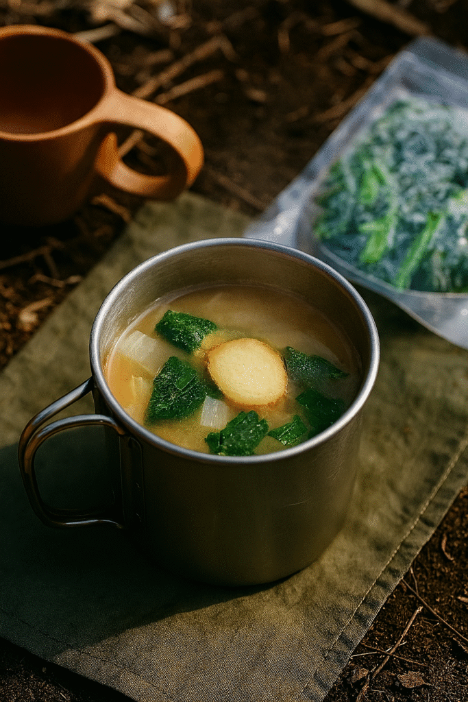 • 材料:味噌汁の素、冷凍ほうれん草やネギ