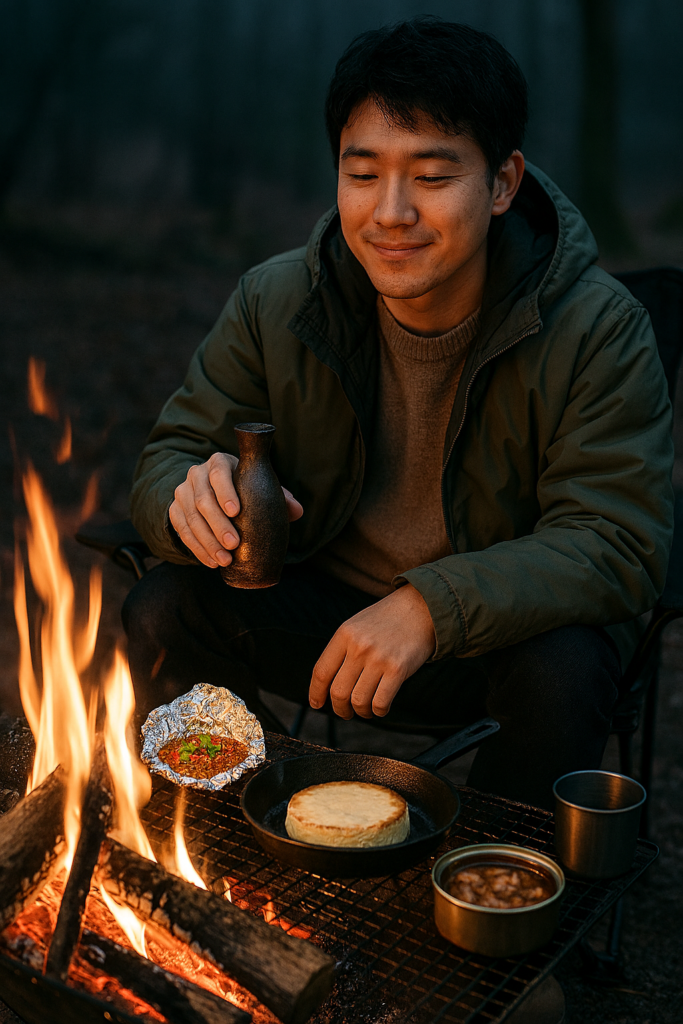 焚き火の炎と熱燗のぬくもりが、孤独を癒してくれる。