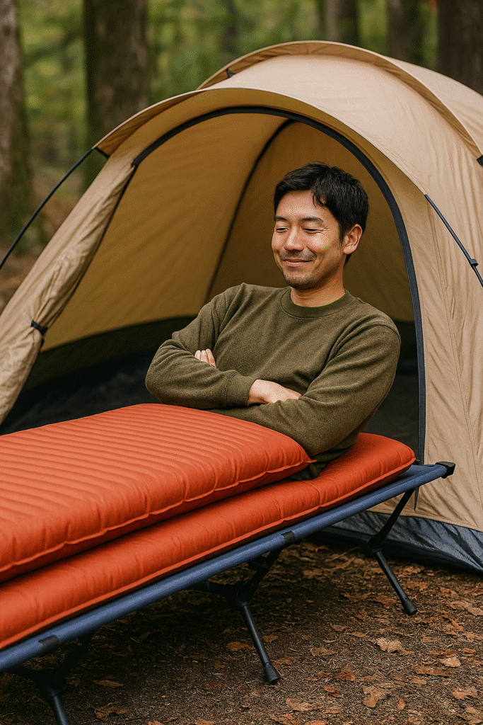 地面の冷気や凹凸は、40代の腰や肩にダメージ大。地面からの距離を取れる「コット」に、クッション性の高いマットを重ねることで、まるでベッドのような寝心地に。